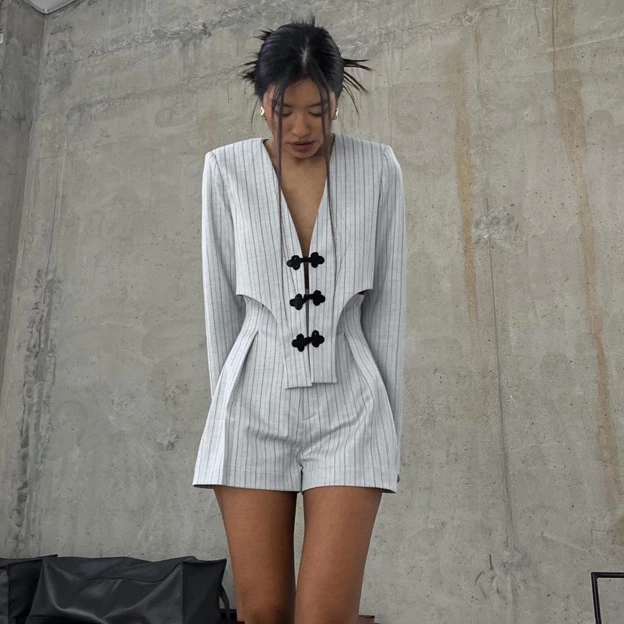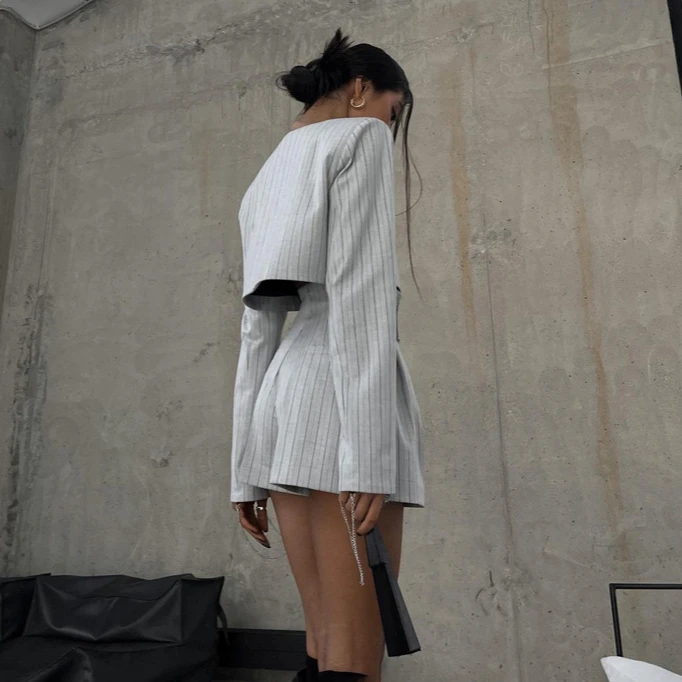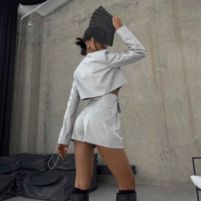 Elegant Slim Long Sleeve Irregular Top With High Waist Shorts Set Streetwear Women Fashion Stripe Print 2 Piece Sets